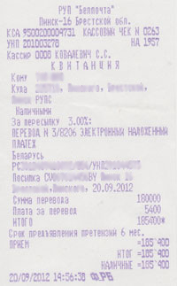 Ниже представлен образец чека, который выдает почта. В чеке содержатся все сведения о плательщике и получателе платежа, дата получения посылки, а так же расшифровка итоговой суммы: сумма перевода+плата за перевод.